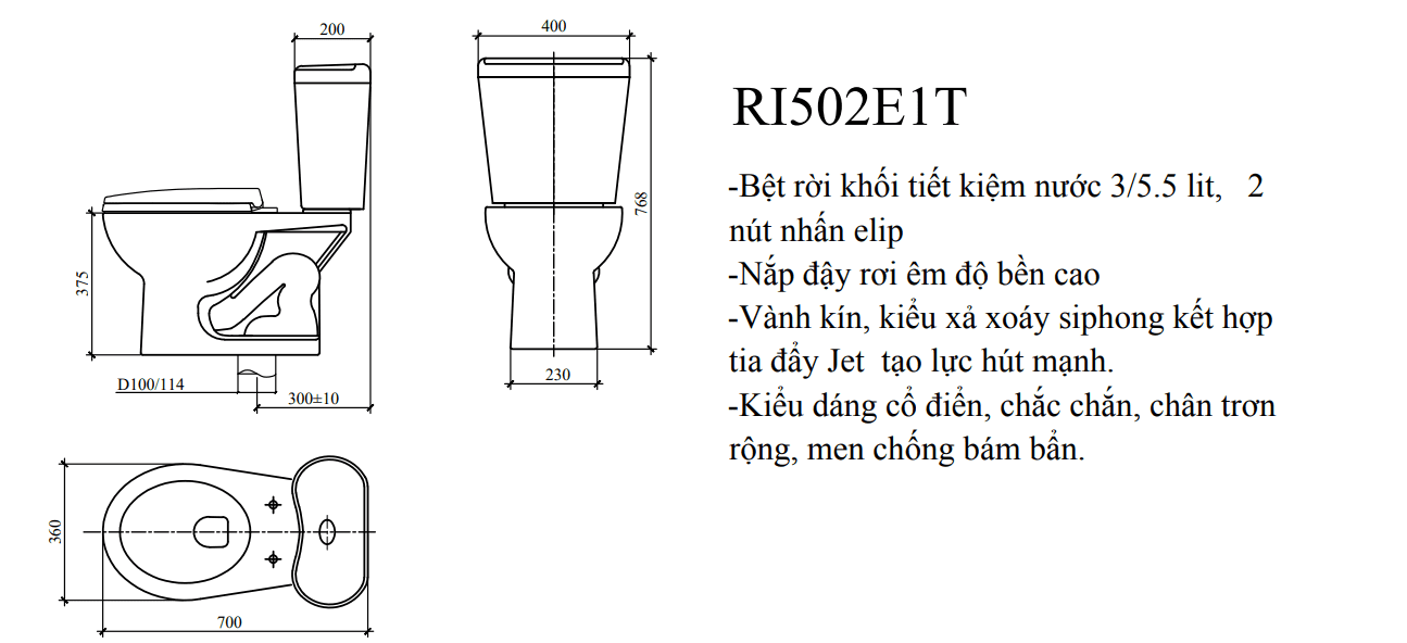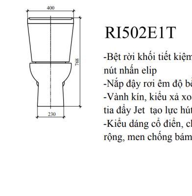 Chế độ xã: Hai chế độ xã (3,6 lít), nút nhấn hình Elíp Kiểu xã: Xã xoáy kết hợp xã thẳng Nắp bàn cầu: Rơi êm