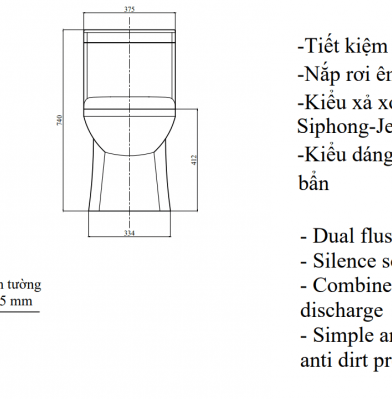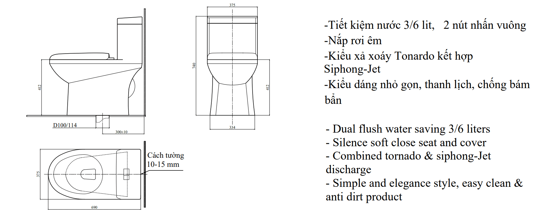 - Tiết kiệm nước, loại 2 nút nhấn vuông (3/6 lít) - Nắp đóng rơi êm nhẹ nhàng - Kiểu xả xoáy tonardo kết hợp tia đẩy Jet tạo lực hút mạnh. - Bàn cầu được thiết kế liền khối kiểu dáng nhỏ gọn, thanh lịch - Sản phẩm chống bám bẩn