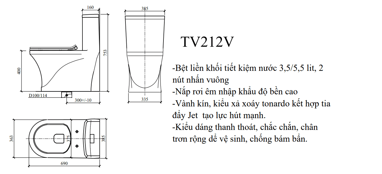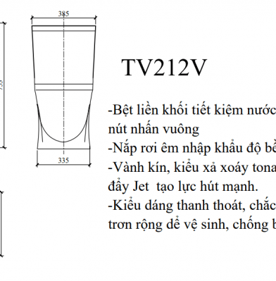 - Tiết kiệm nước, loại 2 nút nhấn vuông (3,5/5,5 lít) - Nắp đóng rơi êm nhẹ nhàng - Kiểu xả xoáy tonardo kết hợp tia đẩy Jet tạo lực hút mạnh. - Bàn cầu được thiết kế liền khối kiểu dáng thanh thoát. - Sản phẩm chống bám bẩn